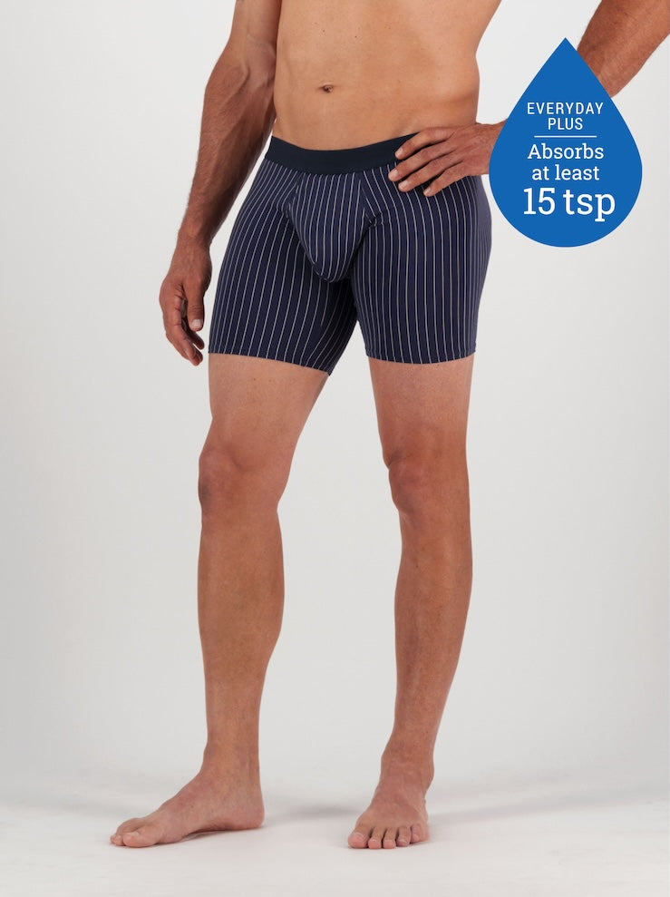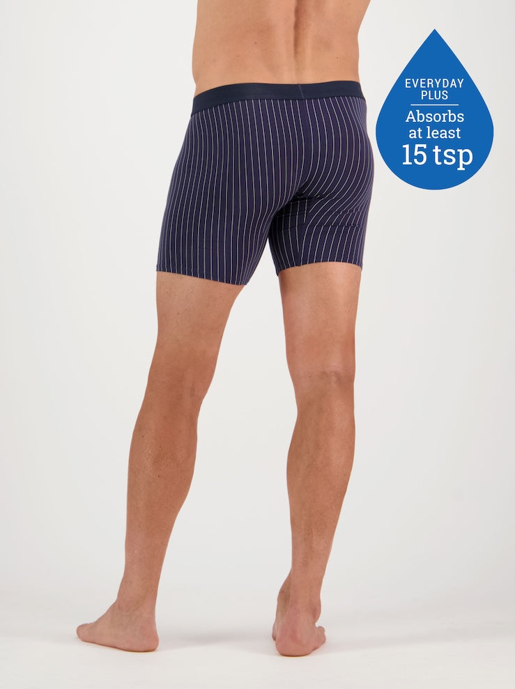 Confitex for Men leakproof long trunks for moderate bladder leakage in navy blue with a grey pinstripe