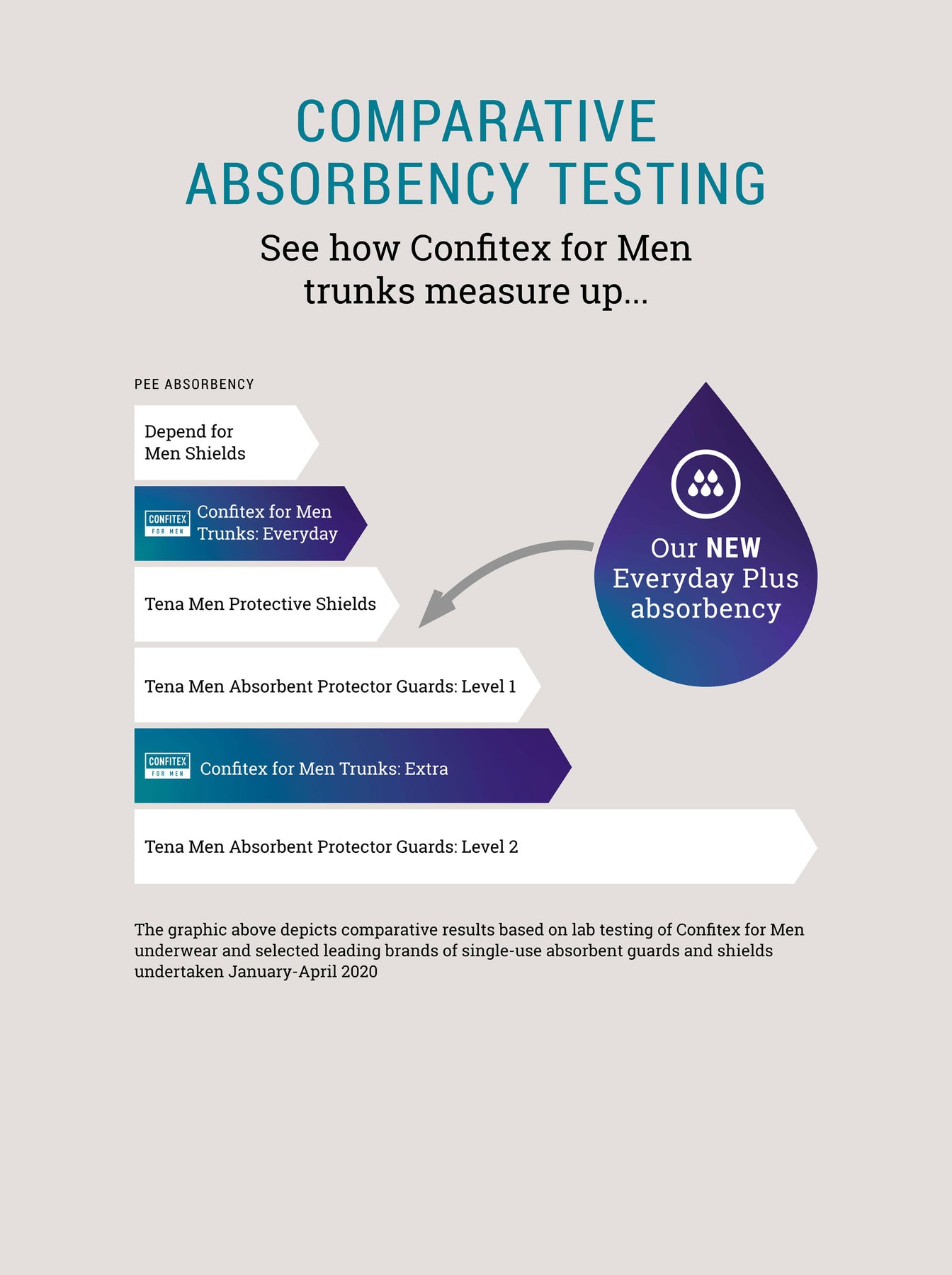 Wondering how our underwear compare to disposable shields and guards? The scale shown below depicts comparative results based on lab testing of Confitex for Men underwear and selected leading brands of single-use absorbent shields and guards undertaken in 2020.