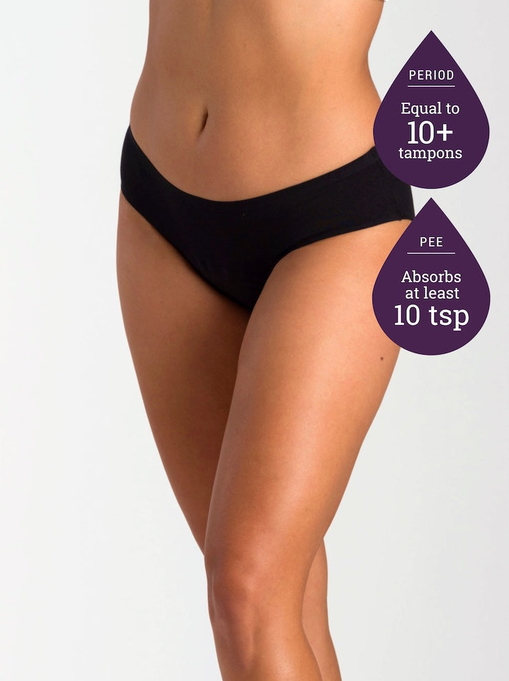 Available in black, they look, feel and fit just like ordinary cotton underwear, but with the added bonus of a slightly thicker (4mm/.16 inch) super-absorbent leakproof panel. Read reviews.