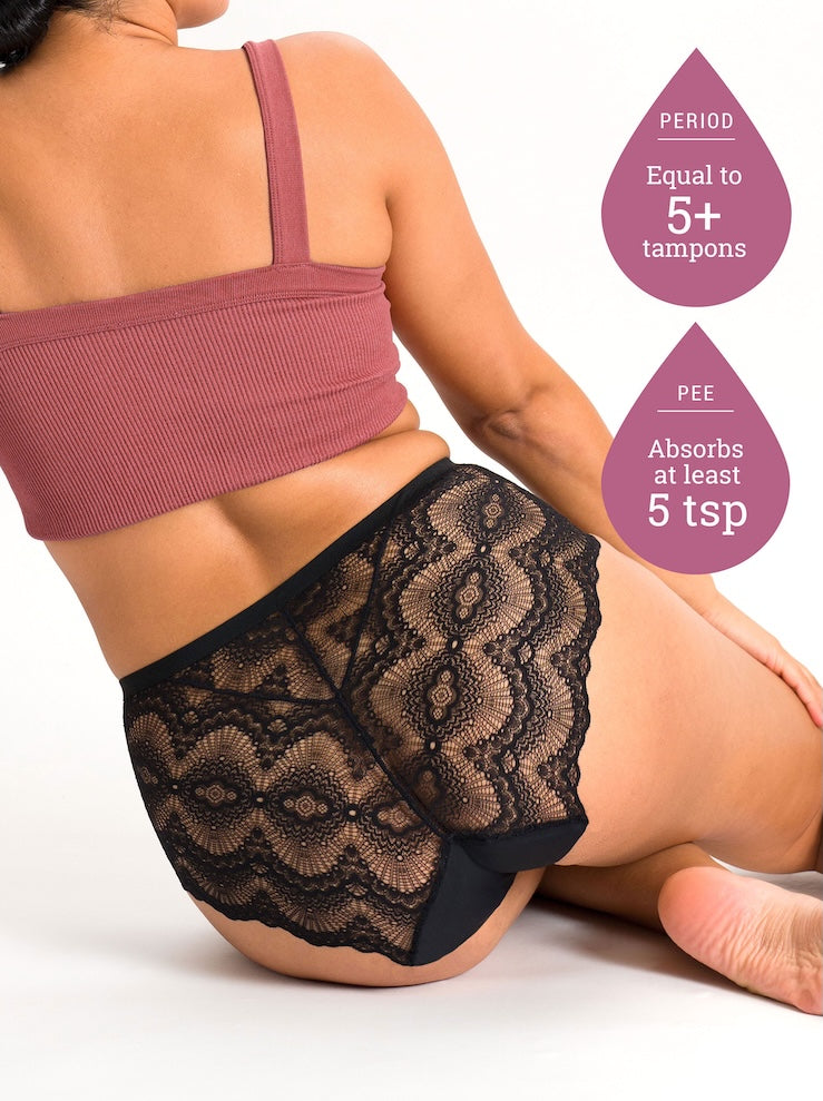 Just’nCase Lace Full Briefs with Everyday Absorbency can be worn for either period or pee protection – without sacrificing your sense of style! They’re ideal on